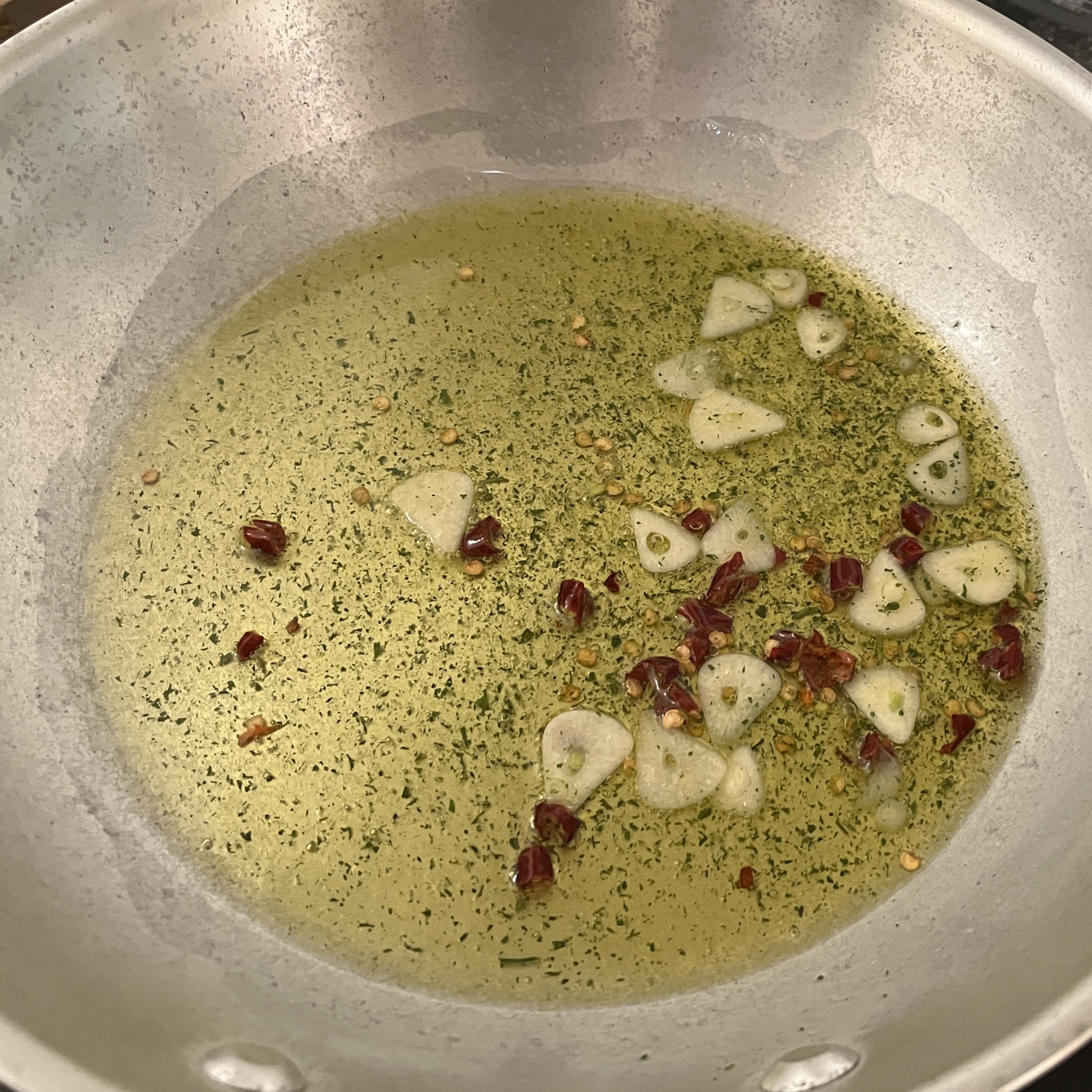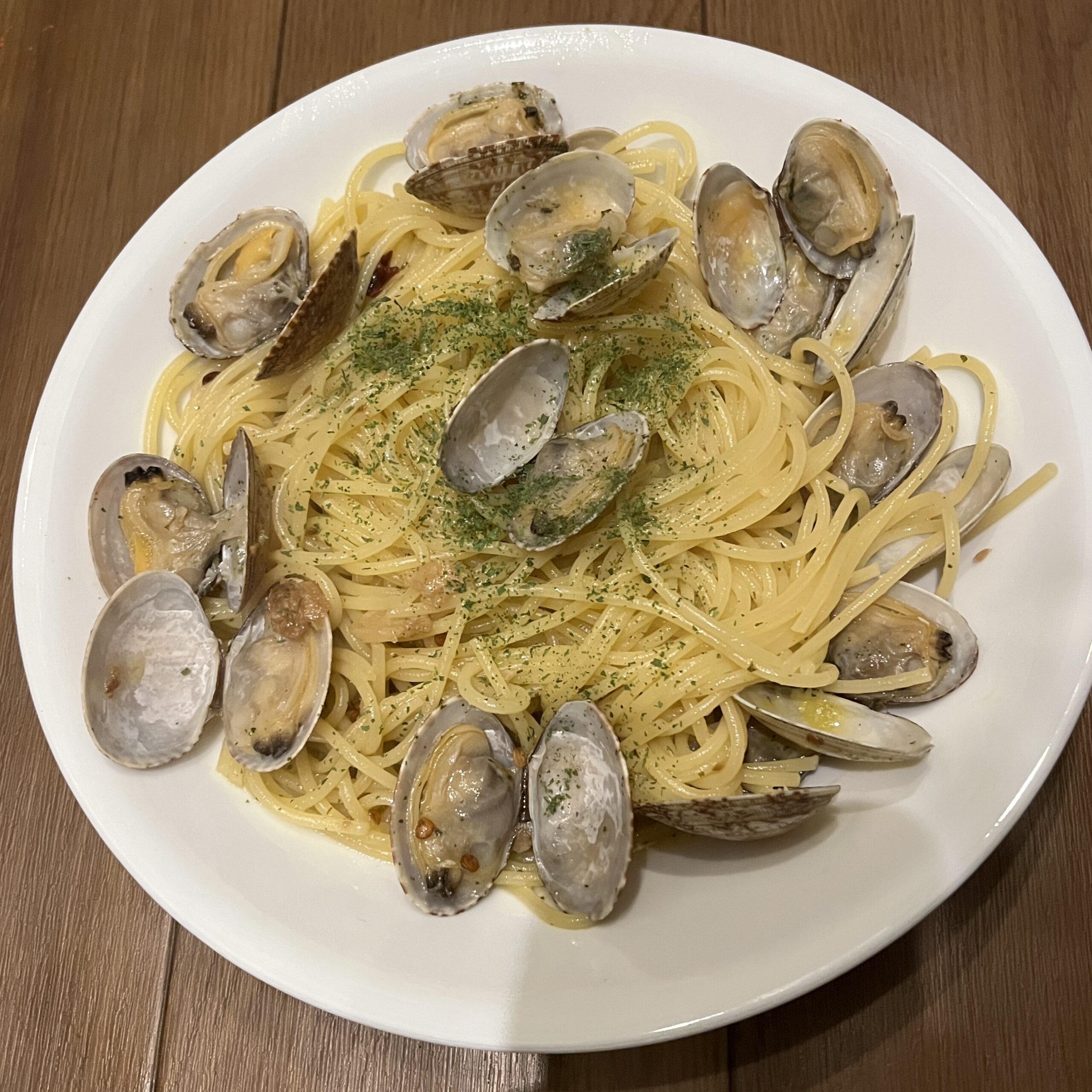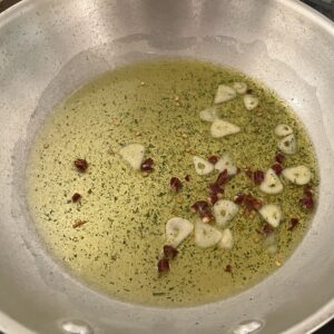 ペペロンチーノならこれで完成です。ここからボンゴレにしましょう。
