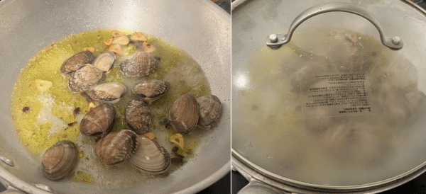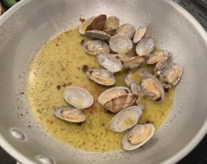 ニンニクに色がついたらアサリ、白ワイン(自分は大さじ4杯くらい。正直ちゃんと計っていません・・・)を入れます。