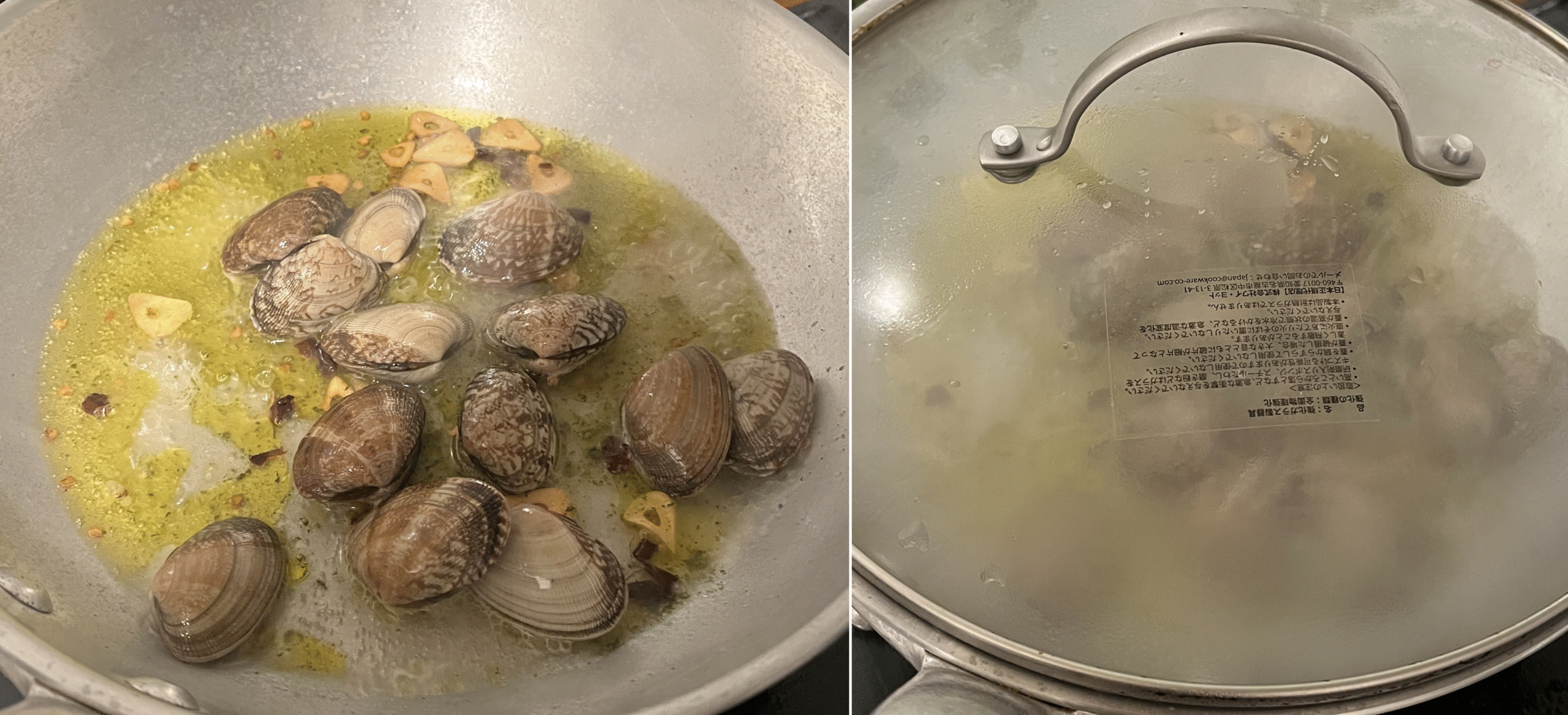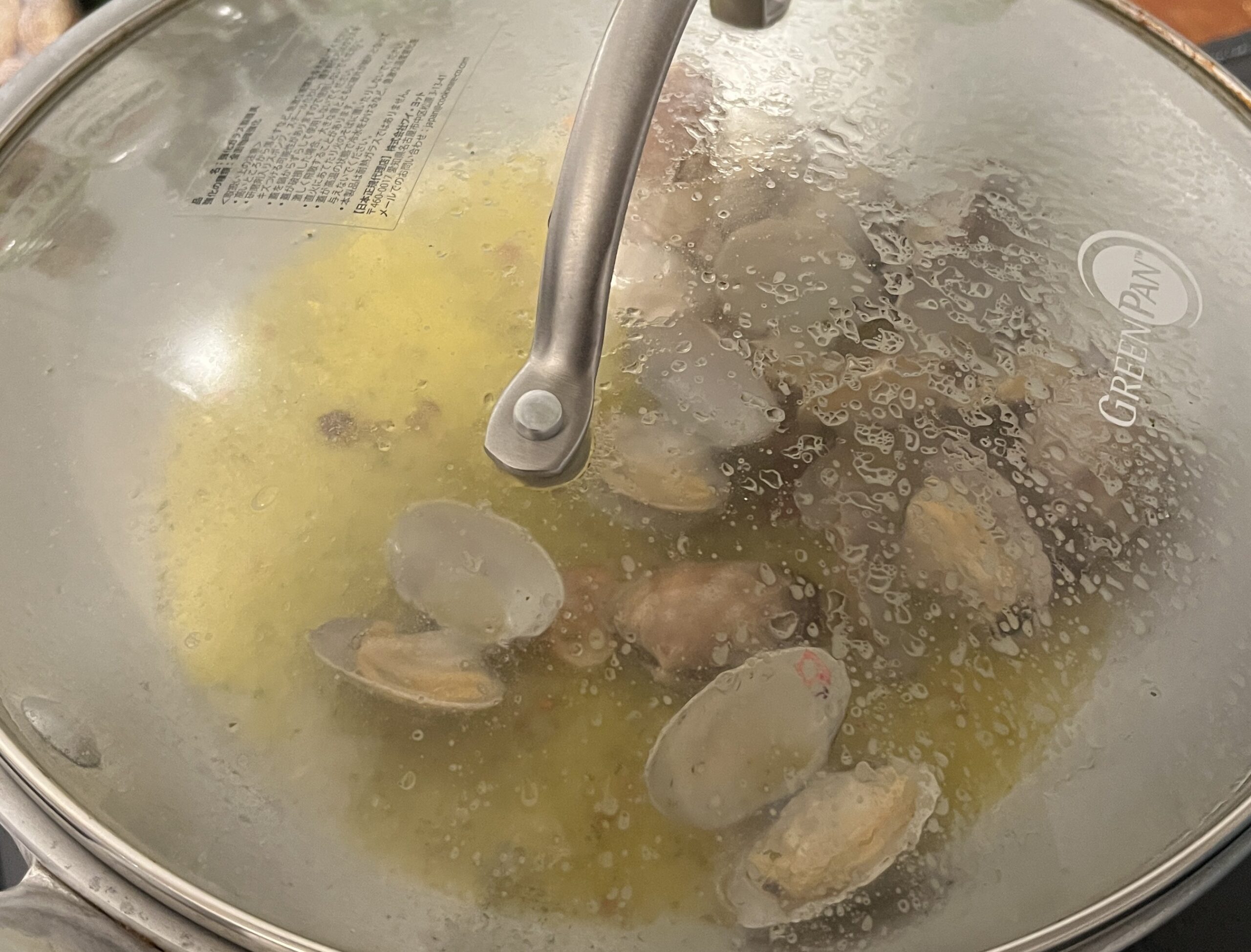 アサリの口が2,3個開いたら火を止め、蓋をしたまま余熱で全て開くまで待ちます。