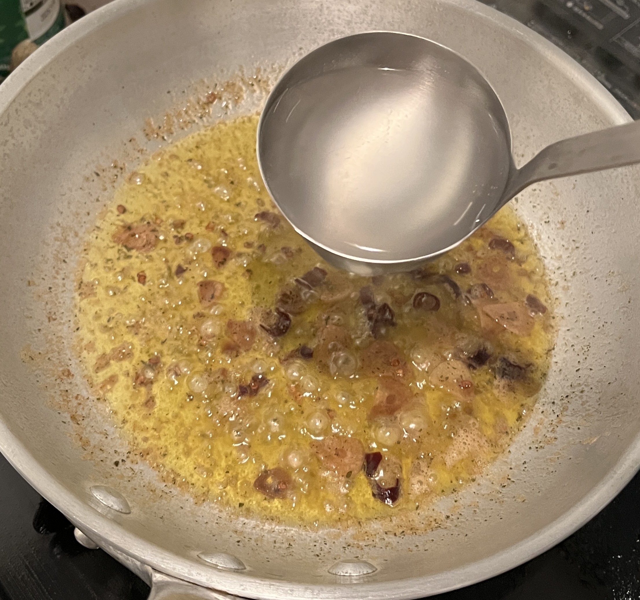 茹であがりの1分30秒前になったら、フライパンにおたま1杯分のゆで汁を加えます。