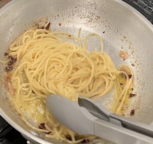 茹であがったパスタを、フライパンに移し、ソースと絡めます。もう一杯ゆで汁を入れ、フライパンを傾けた際にソースが滴るくらいに水を飛ばします。