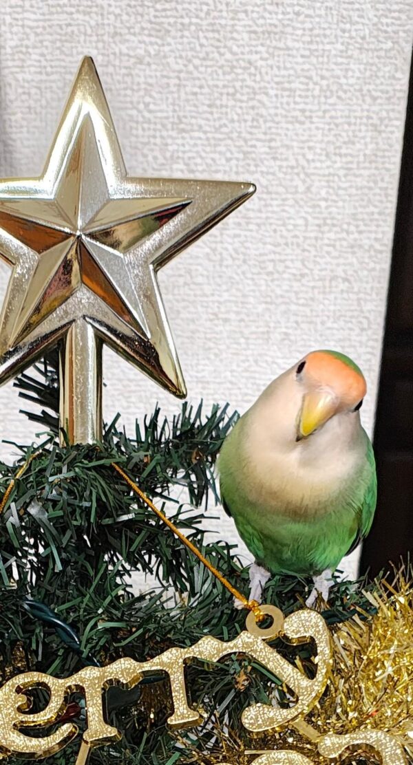 この写真はクリスマスツリーに乗っているところです。かわいい!